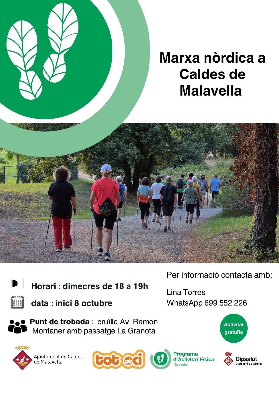 Amb l’objectiu d’oferir una proposta de salut i exercici físic suau, l’Ajuntament de Caldes de Malavella organitza de nou un programa de sortides de marxa nòrdica adreçat a la població adulta. La primera proposta tindrà lloc el 8 d’octubre, de 18 a 19 hores. El punt de trobada i sortida serà la cruïlla entre l’avinguda Ramon Montaner i el passatge de La Granota. La participació és gratuïta, però cal inscriure-s'hi al WhatsApp 699 552 226 (Lina Torres).