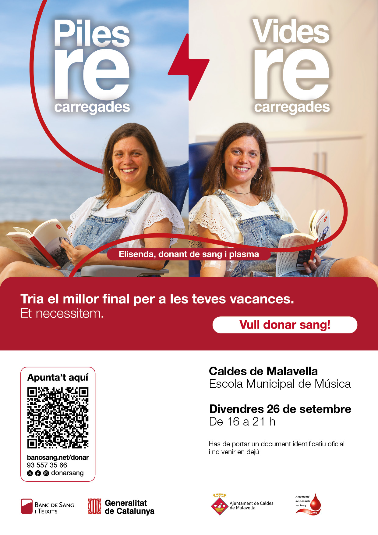 Amb el lema “Tria el millor final per a les teves vacances. Et necessitem.”, la campanya anima la ciutadania a contribuir a salvar vides tot aprofitant el retorn de les vacances. La protagonista del cartell, Elisenda, exemplifica el gest solidari de donar sang i plasma, amb el missatge que aquest acte pot recarregar tant les piles com les vides.