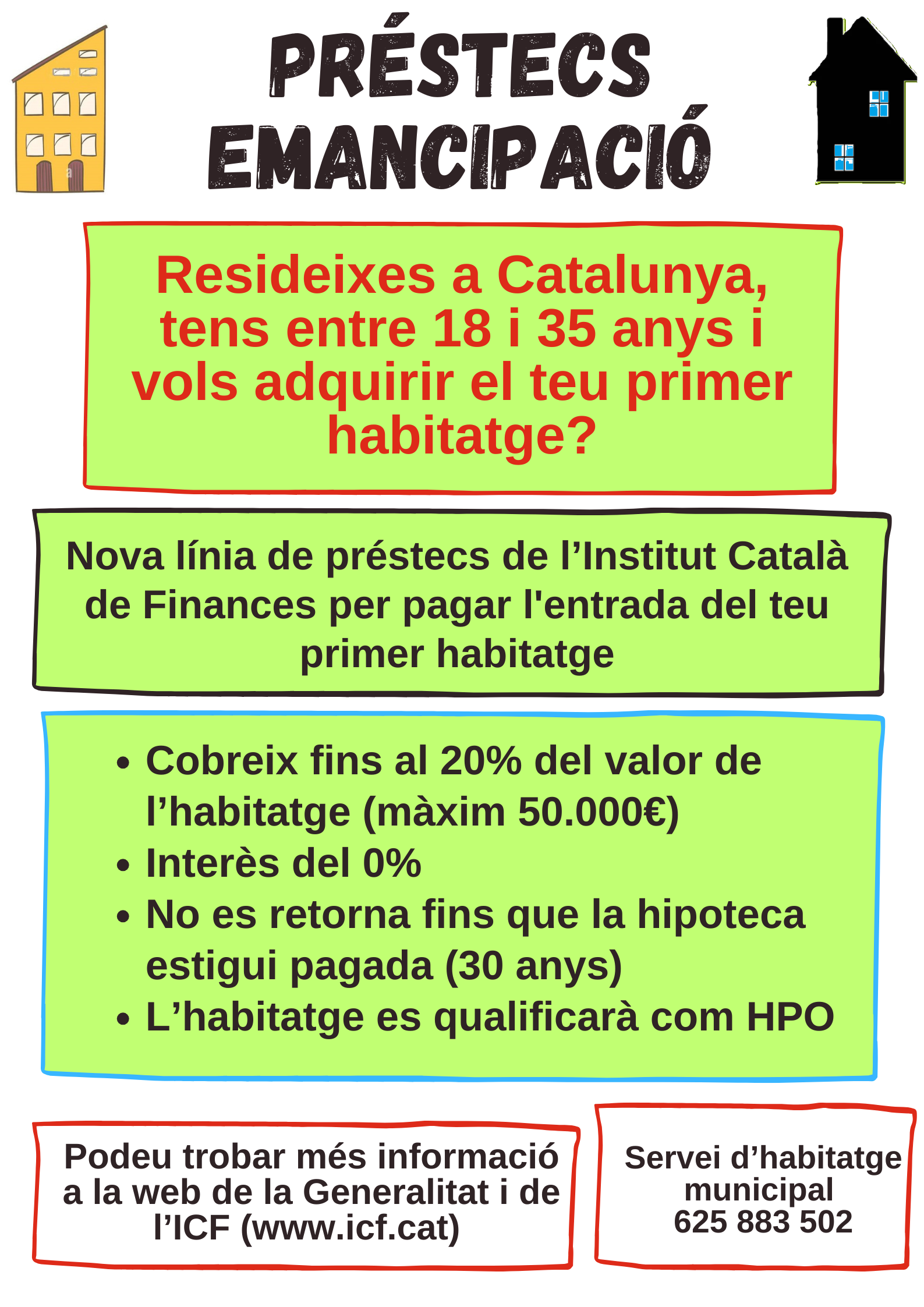 L’Institut Català de Finances (ICF), en col·laboració amb la Generalitat de Catalunya, ha posat en marxa una nova línia de préstecs anomenada Préstecs Emancipació, adreçada a joves d’entre 18 i 35 anys que resideixin a Catalunya i vulguin adquirir el seu primer habitatge.