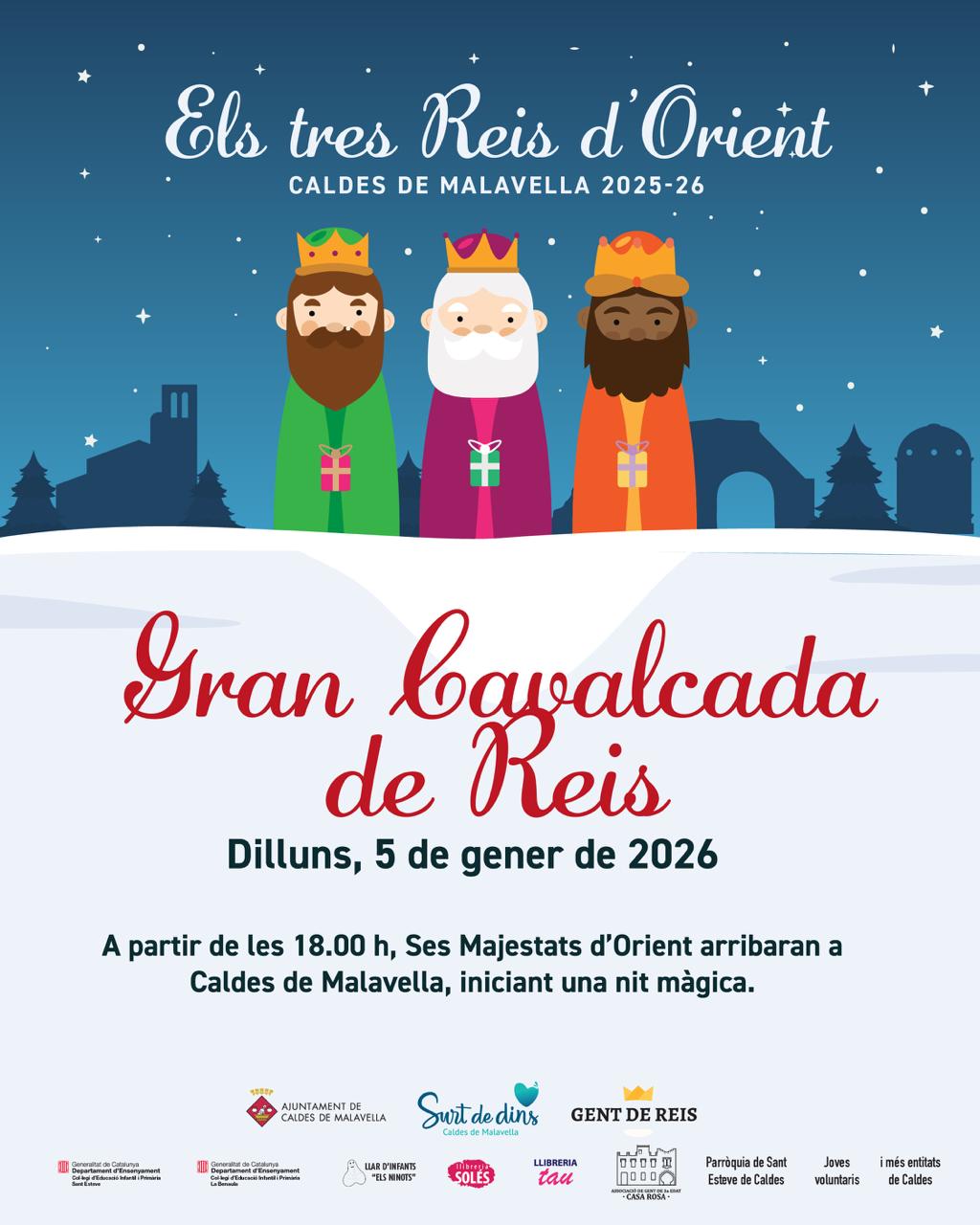 Ses Majestats d’Orient arribaran a Caldes de Malavella el 5 de gener, a les sis de la tarda, per iniciar una nit màgica. Vindran carregades d’il·lusió, regals, joguines, caramels i, per als més trapelles, fins i tot una mica de carbó!