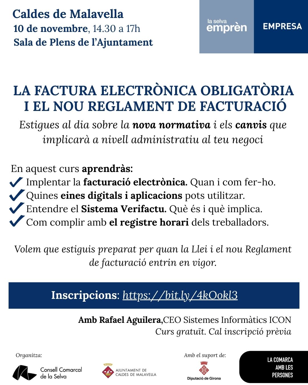 El pròxim 10 de novembre, de 14.30 h a 17 h, la Sala de Plens de l’Ajuntament de Caldes de Malavella acollirà una sessió formativa gratuïta sobre la factura electrònica obligatòria i el nou reglament de facturació.