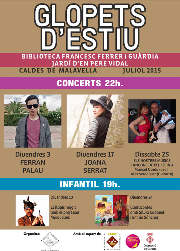 La Biblioteca Municipal Francesc Ferrer i Guàrdia de Caldes de Malavella ofereix un nou cicle de concerts gratuïts dins del Glopets d'Estiu que pretén donar veu a algunes de les bandes i músics més interessants del panorama musical a casa nostra. Aquest divendres en farem el primer glopet.
