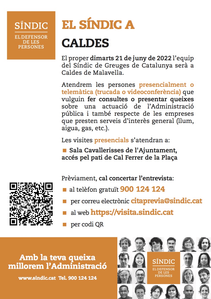 El proper dimarts 21 de juny de 2022 l’equip del Síndic de Greuges de Catalunya serà a Caldes de Malavella. Atendran les persones presencialment o de forma telemàtica (trucada o videoconferència) que vulguin fer consultes o presentar queixes sobre una actuació de l’Administració pública i també respecte de les empreses que presten serveis d’interès general (llum, aigua, gas, etc.).
