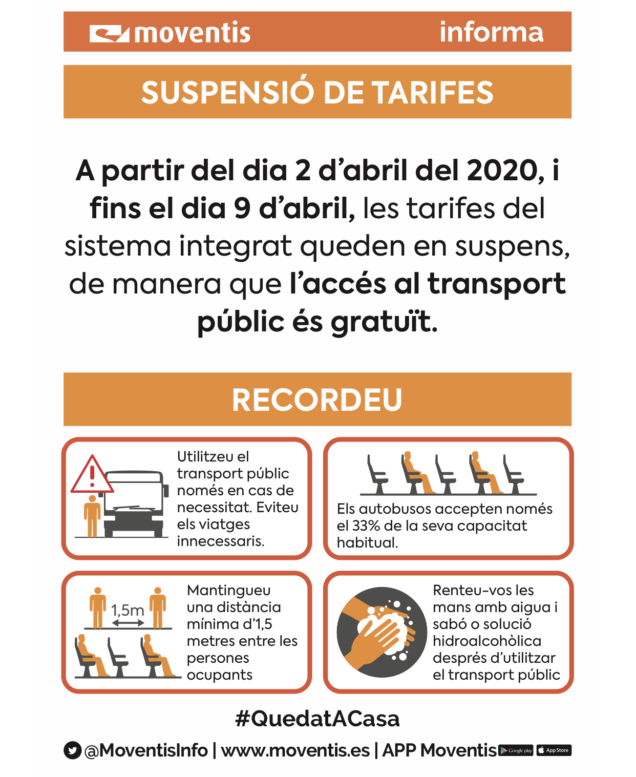 Per tant com a conseqüència de la pandèmia del COVID-19 i a la vista del contingut aprovat pel Departament de Territori i Sostenibilitat l’empresa SARFA S.L. aplicarà amb efectes a partir de dijous dia 2 d’Abril, la gratuïtat del nostre servei a tots els usuaris i usuàries en tots els itineraris.