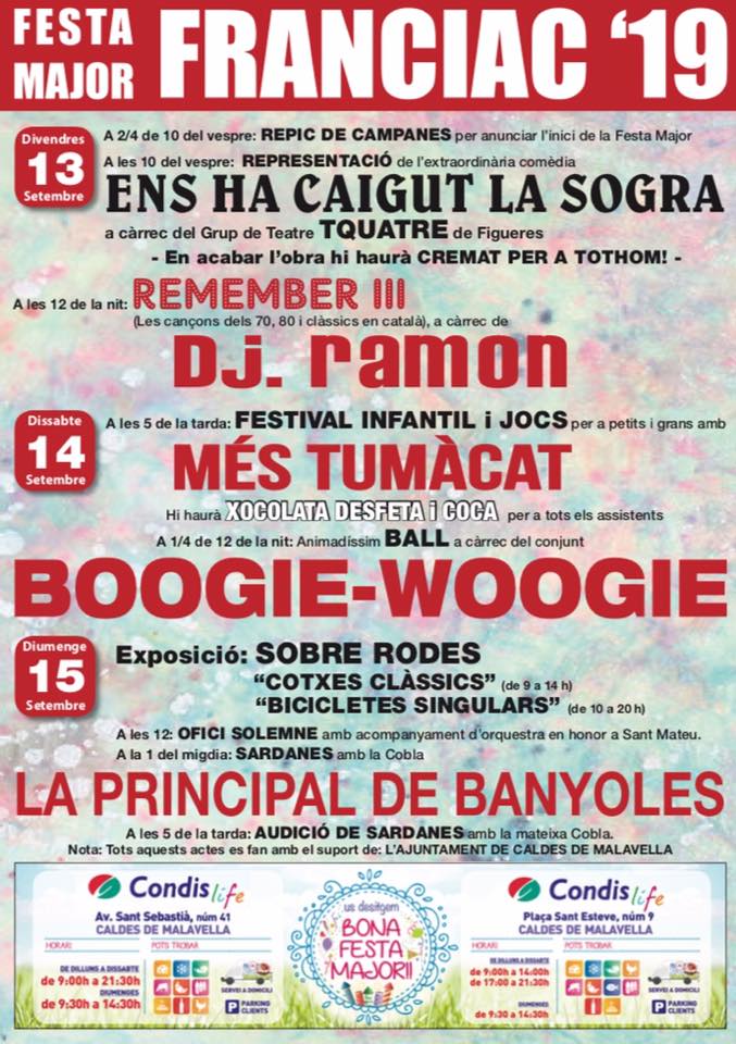 Del 13 al 15 de setembre arriba la Festa Major de Franciac. La comissió de festes ha preparat, amb el suport de l’Ajuntament i elscol·laboradors, tres diesfarcits d’activitats per a totes les edats. La Festacomençaràdivendresamb el tradicional repicament de campanes, tot seguir hi hauràteatre i música tot fent un viatge en el tempsfent un revival dels anys 70 i 80 amb Dj Ramon. El dissabteés el diapensat pels méspetitsamb el festival infantil i xocolatada, al vespre ball ambBooguie – Woogie. La Festaacabaràdiumengeambl’oficireligiós, i sardanes.Tampoc hi faltaràl’exposició, aquestavegada de cotxesclàssics i bicicletes singulars.Bona Festa Major!