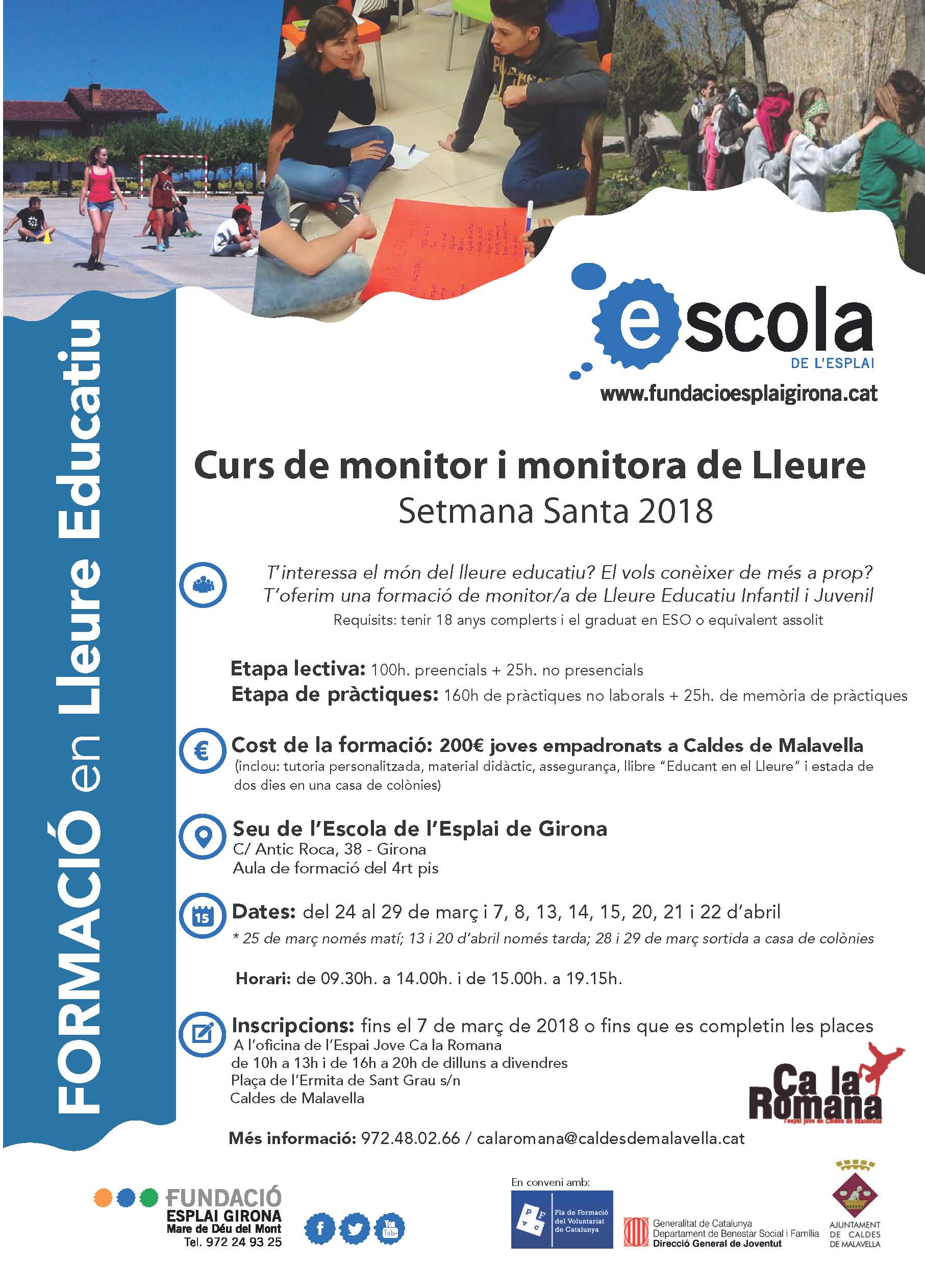 Durant la Setmana Santa del 2018, des de l’Ajuntament de Caldes de Malavella, es fa una aportació econòmica per a cada alumne empadronat a Caldes que vulgui realitzar els cursos de Monitor/a de Lleure i Premonitor/a de lleure.