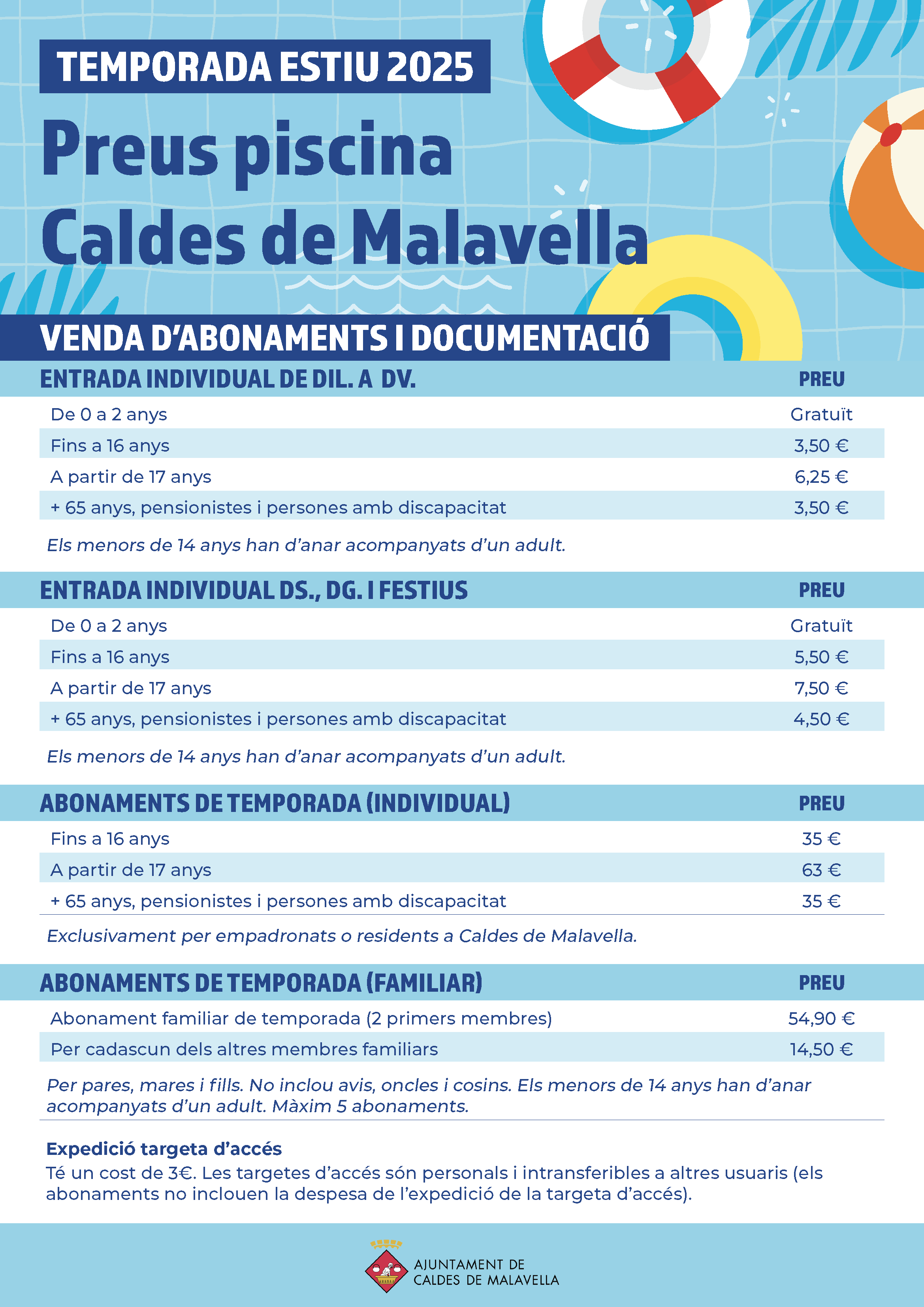 El carnet de temporada pels menors de 16 anys i els pensionistes serà de 35 €, pels adults, de 63 €. És exclusiu per a persones empadronades o residents a Caldes de Malavella. L’abonament familiar tindrà un cost de 54,90 € per dues persones i de 14,50 € per a la resta de membres, i es podran adquirir com a màxim cinc abonaments. El vincle familiar ha de ser de pares, mares i fills (on inclou avis, oncles ni cosins).