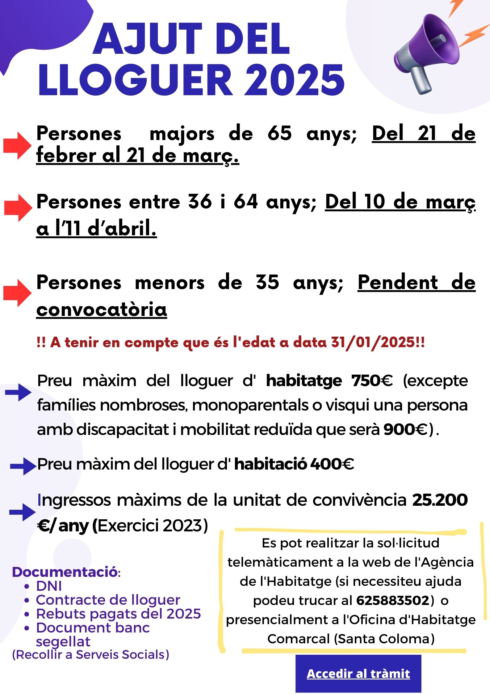 Ja es poden sol·licitar els ajuts al lloguer 2025 per facilitar l’accés a l’habitatge. Les sol·licituds es poden presentar de manera telemàtica a través de la web de l’Agència de l’Habitatge o de manera presencial a l’Oficina d’Habitatge Comarcal de Santa Coloma. Si necessiteu ajuda, podeu trucar al 625 883 502.