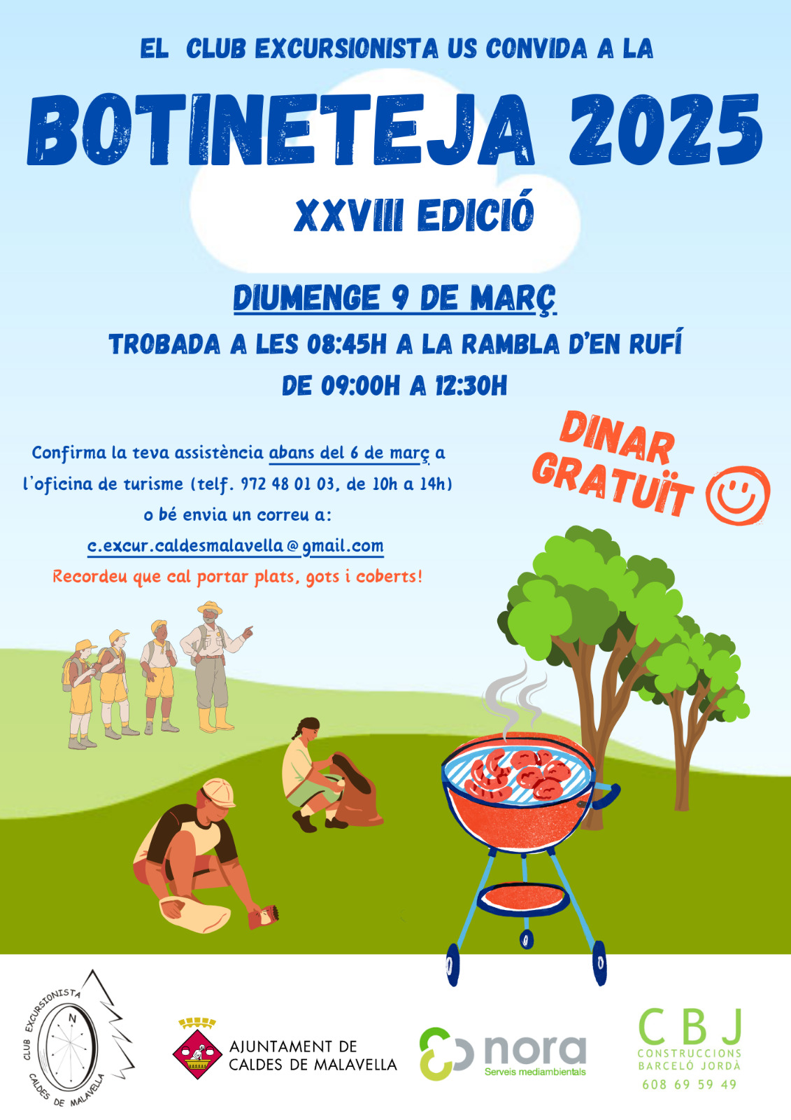 El Club Excursionista de Caldes de Malavella convida tothom a participar en la Botineteja 2025, que serà la 28a edició de la proposta. L’activitat consisteix a reunir-se en un espai del municipi, que serà la rambla d’en Rufí, i fer una jornada de neteja d’escombraries i deixalles en zones verdes del poble, que finalitzarà en un dinar popular gratuït. Es farà el 9 de març, al matí.