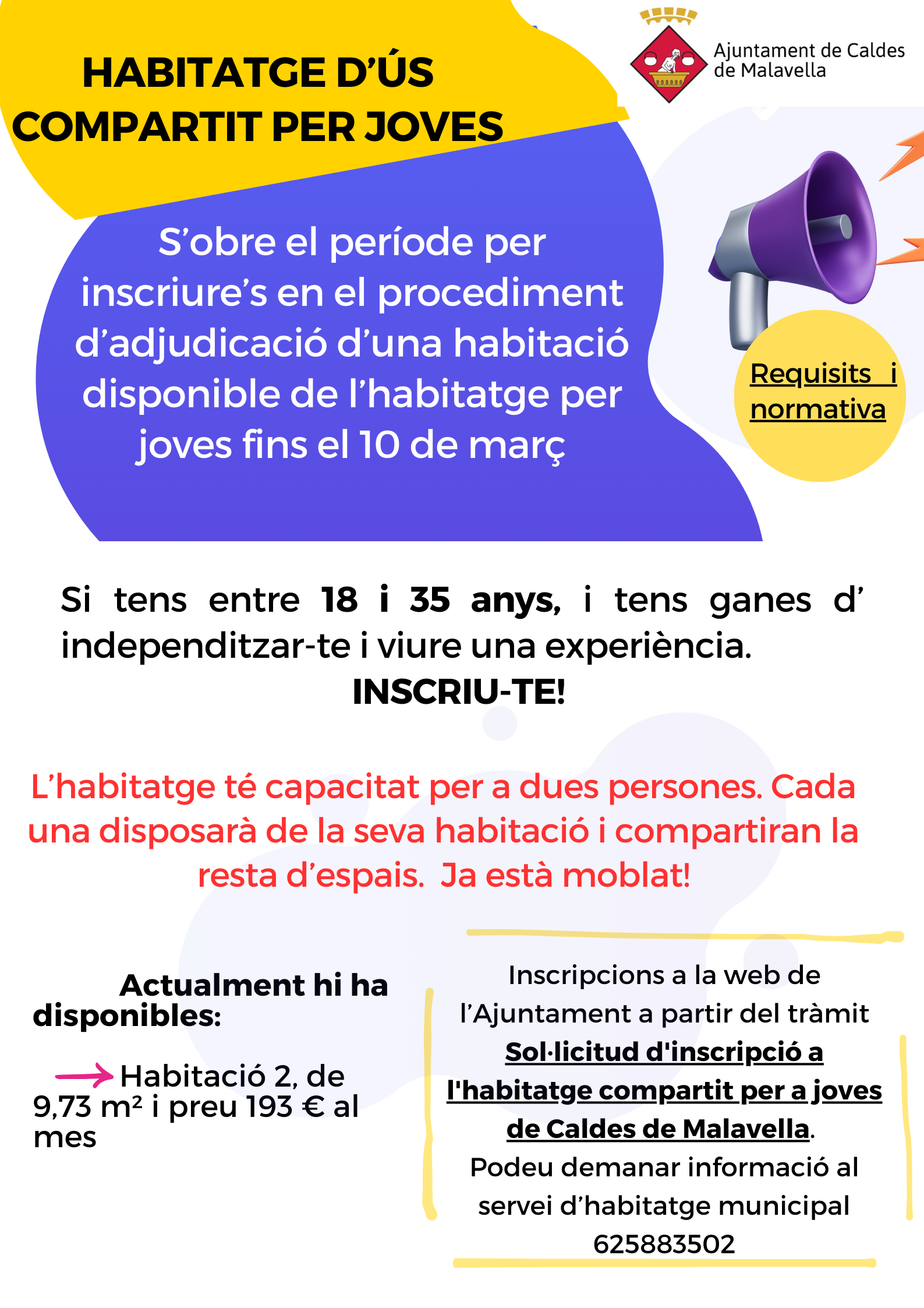 L’Ajuntament de Caldes de Malavella ha obert el període d’inscripció per a joves d’entre 18 i 35 anys interessats a accedir a una habitació a l’habitatge compartit situat al municipi.