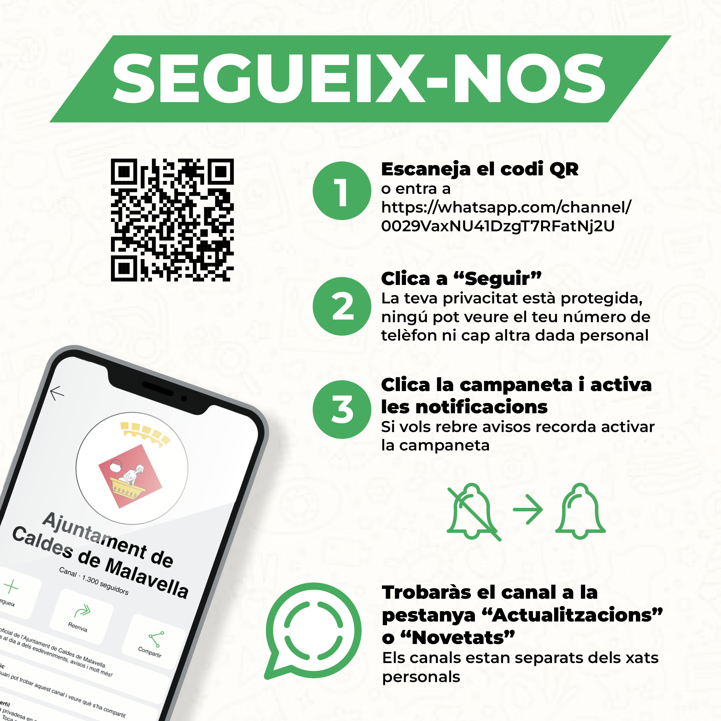 - L’Ajuntament de Caldes activa un canal de difusió propi a WhatsApp, la principal eina de missatgeria instantània. La nova funcionalitat ‘Canals’ de l’aplicació de Meta permet difondre de forma ràpida, senzilla i privada continguts d’alt valor per a la ciutadania. També facilita que aquesta informació oficial es pugui compartir ràpidament i arribi a molta més gent.