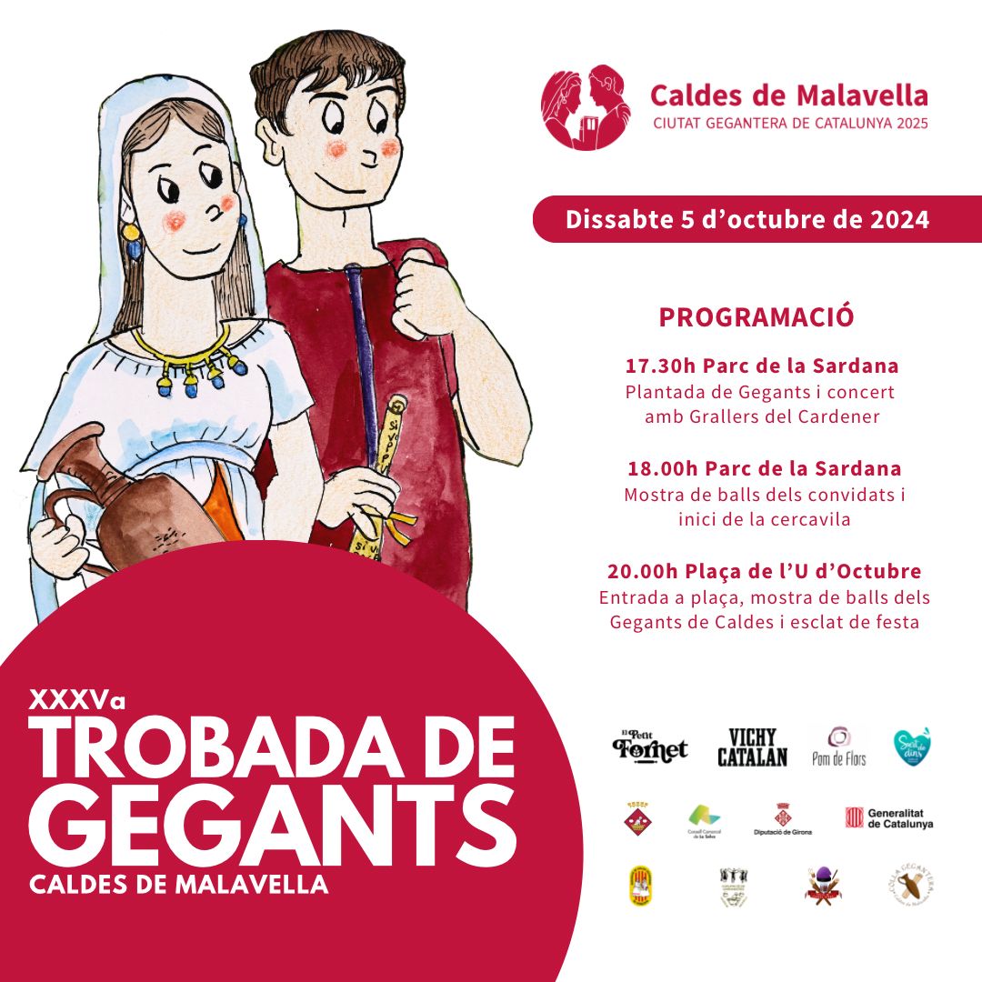 El pròxim dissabte 5 d'octubre de 2024, la vila de Caldes de Malavella acollirà la XXXVa Trobada de Gegants, enguany molt especial després de ser escollida com a Ciutat Gegantera de Catalunya 2025. L'esdeveniment començarà a les 17.30 h al Parc de la Sardana, on es durà a terme la plantada de Gegants acompanyada d'un concert dels Grallers del Cardener.