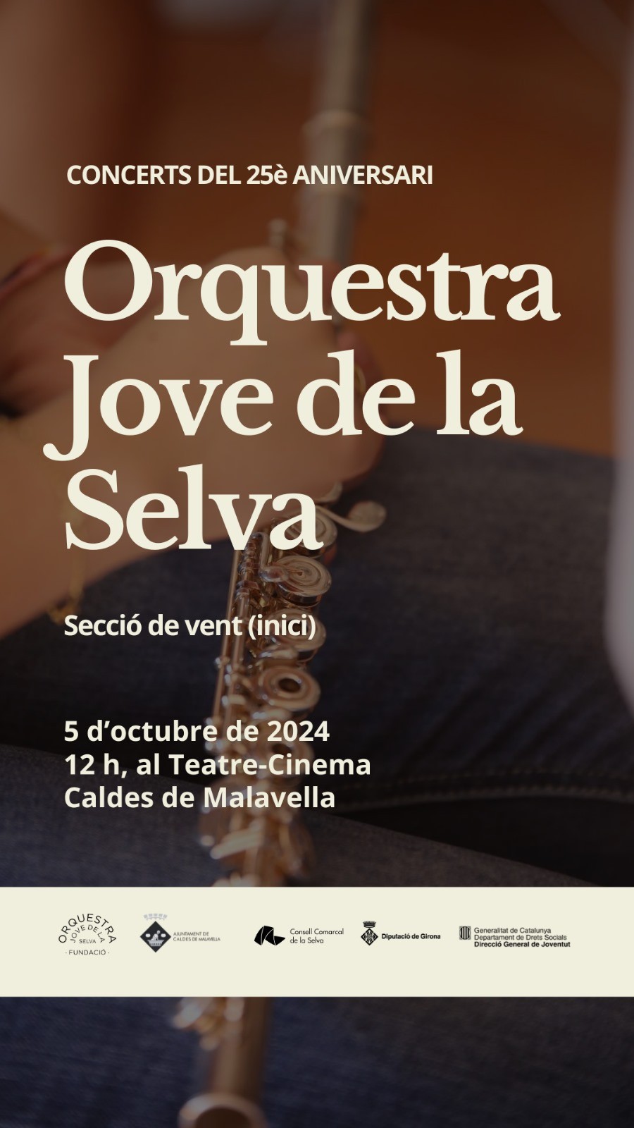 En el marc del 25è Aniversari, l’Orquestra Jove de la Selva oferirà un concert gratuït al Teatre-Cinema de Caldes de Malavella, amb la secció de vent com a protagonista principal. Serà el 5 d’octubre, a les 12 del migdia.