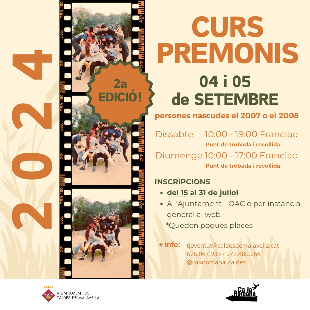 Els dies 4 i 5 de setembre es farà la segona edició del Curs Premonis, adreçat a persones nascudes entre el 2007 i el 2008 que vulguin ser premonitors. Les inscripcions obriran el 15 de juliol i es podran fer abans que acabi el mes, a l’OAC de l’Ajuntament o a la web, mitjançant una instància general.