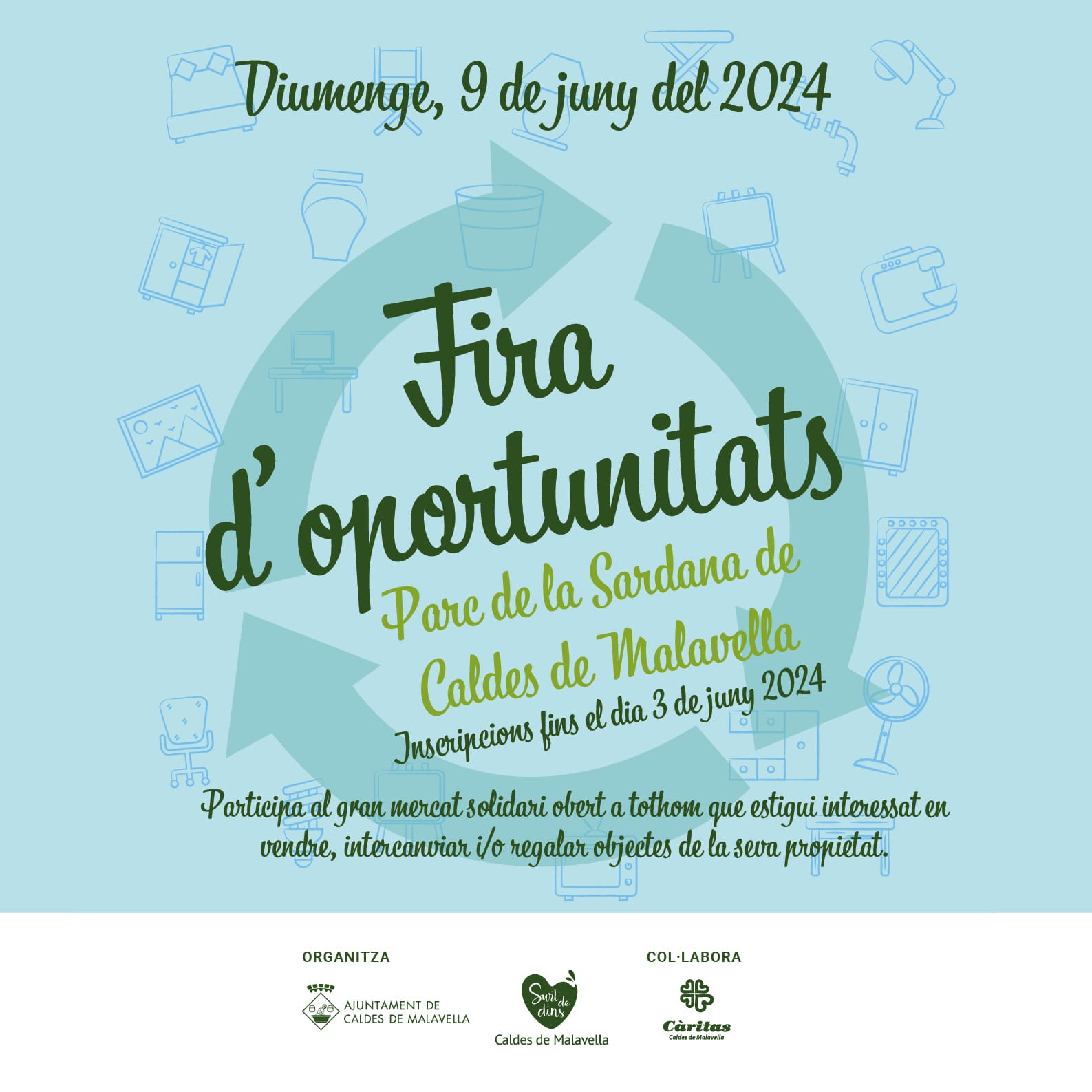 El pròxim diumenge 9 de juny de 2024, el Parc de la Sardana de Caldes de Malavella acollirà la Fira d'Oportunitats, un gran mercat solidari obert a tothom interessat a vendre, intercanviar i/o regalar objectes de la seva propietat. Aquest esdeveniment, organitzat amb la col·laboració de l’Ajuntament de Caldes de Malavella, pretén fomentar la solidaritat i la sostenibilitat entre els residents i visitants.