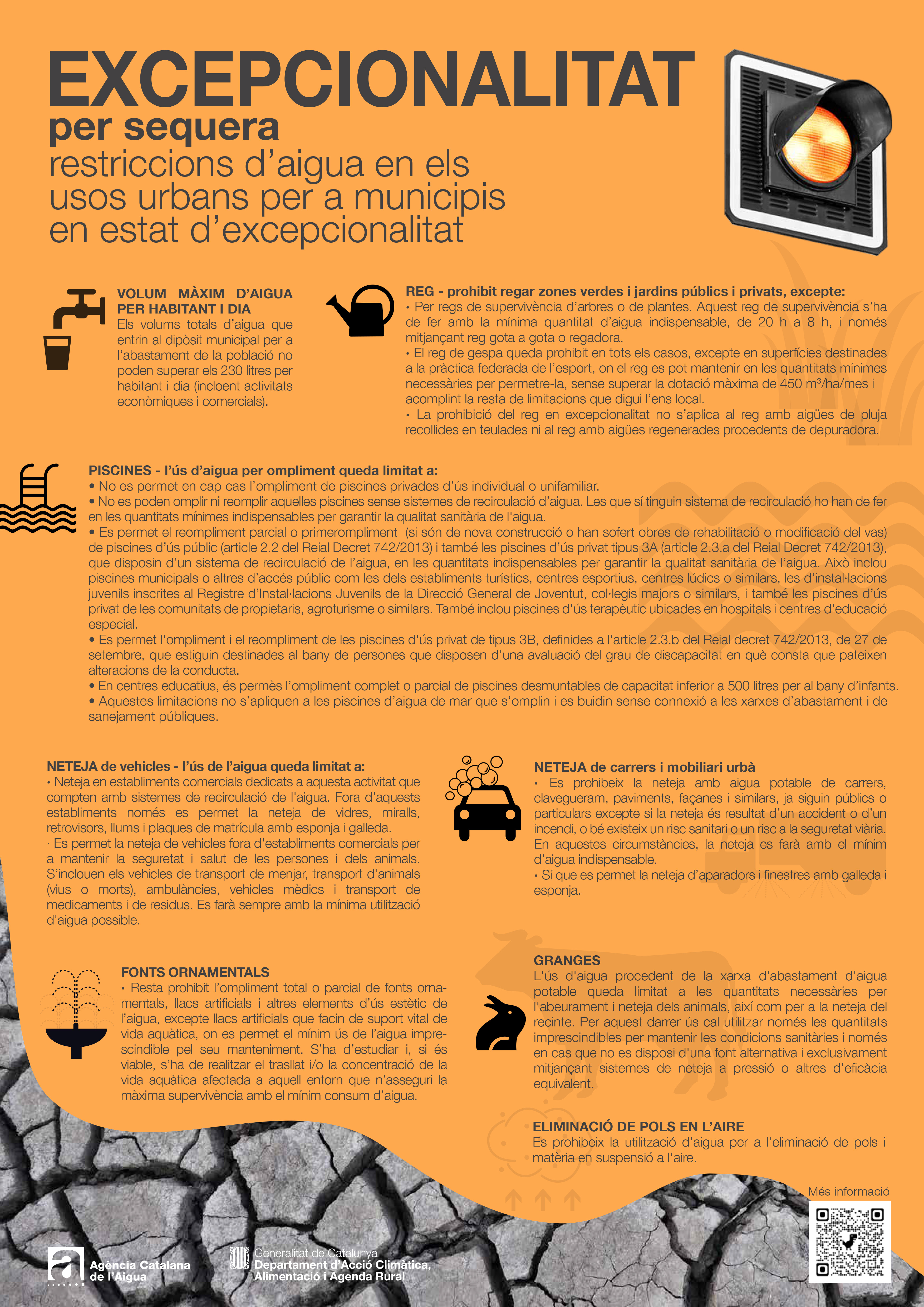L'excepcionalitat per sequera, que entrarà en vigor dilluns vinent, suposa augmentar de 200 a 230 litres el consum màxim per habitant i dia. A més, inclou aquestes restriccions sectorials: es manté la prohibició de regar zones verdes -excepte reg de supervivència- i es permet el reompliment de piscines col·lectives.