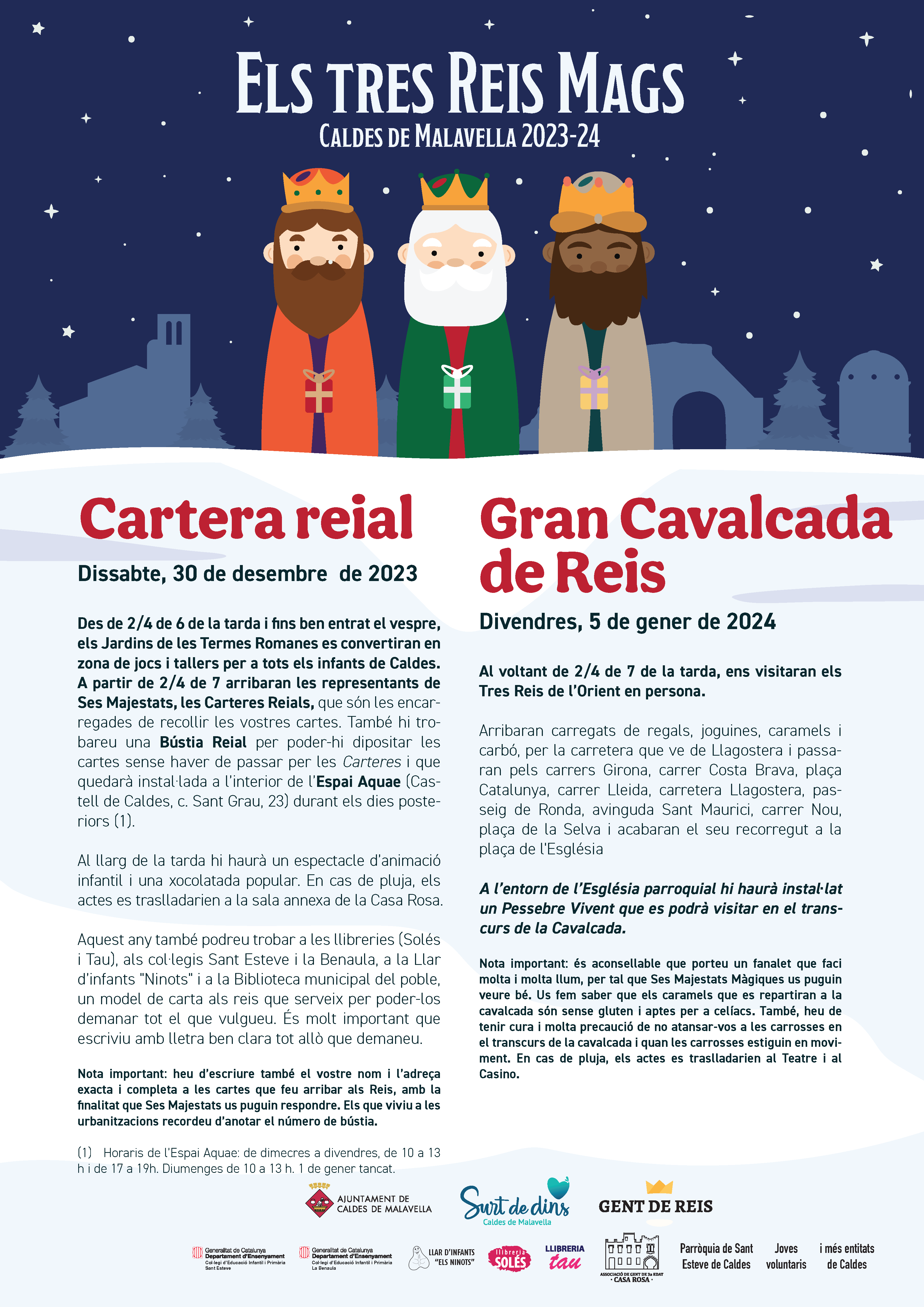 Nota important cavalcada: és aconsellable que porteu un fanalet que faci molta i molta llum, per tal que Ses Majestats Màgiques us puguin veure bé. Us fem saber que els caramels que es repartiran a la cavalcada són sense gluten i aptes per a celíacs. També, heu de tenir cura i molta precaució de no atansar-vos a les carrosses en el transcurs de la cavalcada i quan les carrosses estiguin en moviment. En cas de pluja, els actes es traslladarien al Teatre i al Casino.
