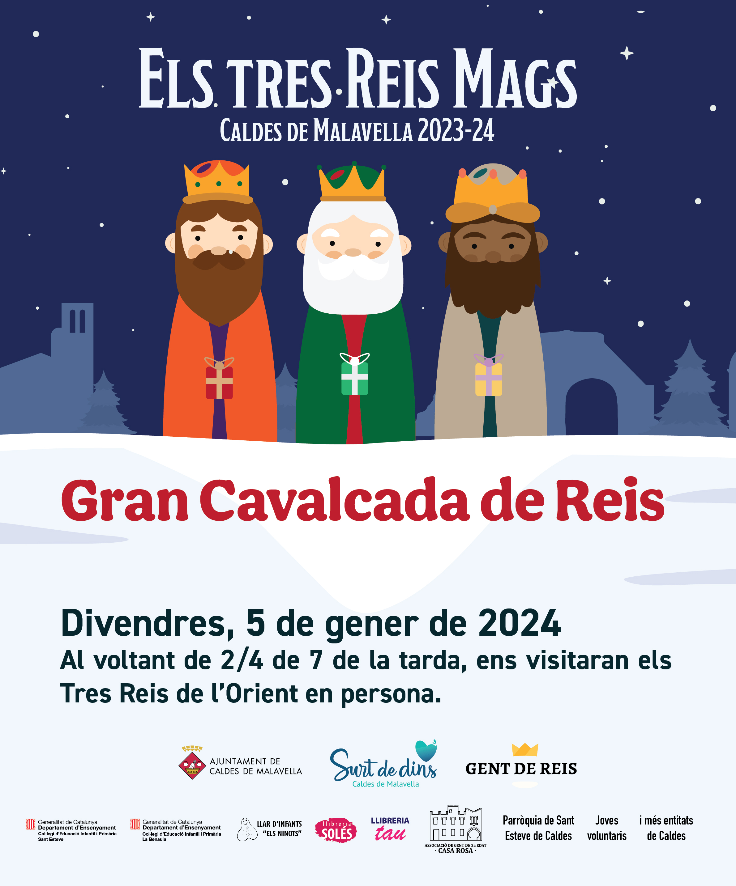 Com és tradició, el divendres dia 5 de gener (de 2024), tota la comitiva reial arribarem a Caldes de Malavella al voltant de 2/4 de 7 de la tarda. Esperem que ens il·lumineu molt amb els vostres fanalets i que ens canteu ben fort i clar aquella cançó que ens agrada tant. Així doncs, ens veurem ben aviat. Porteu-vos molt bé i rebeu un fort petó de tots nosaltres.