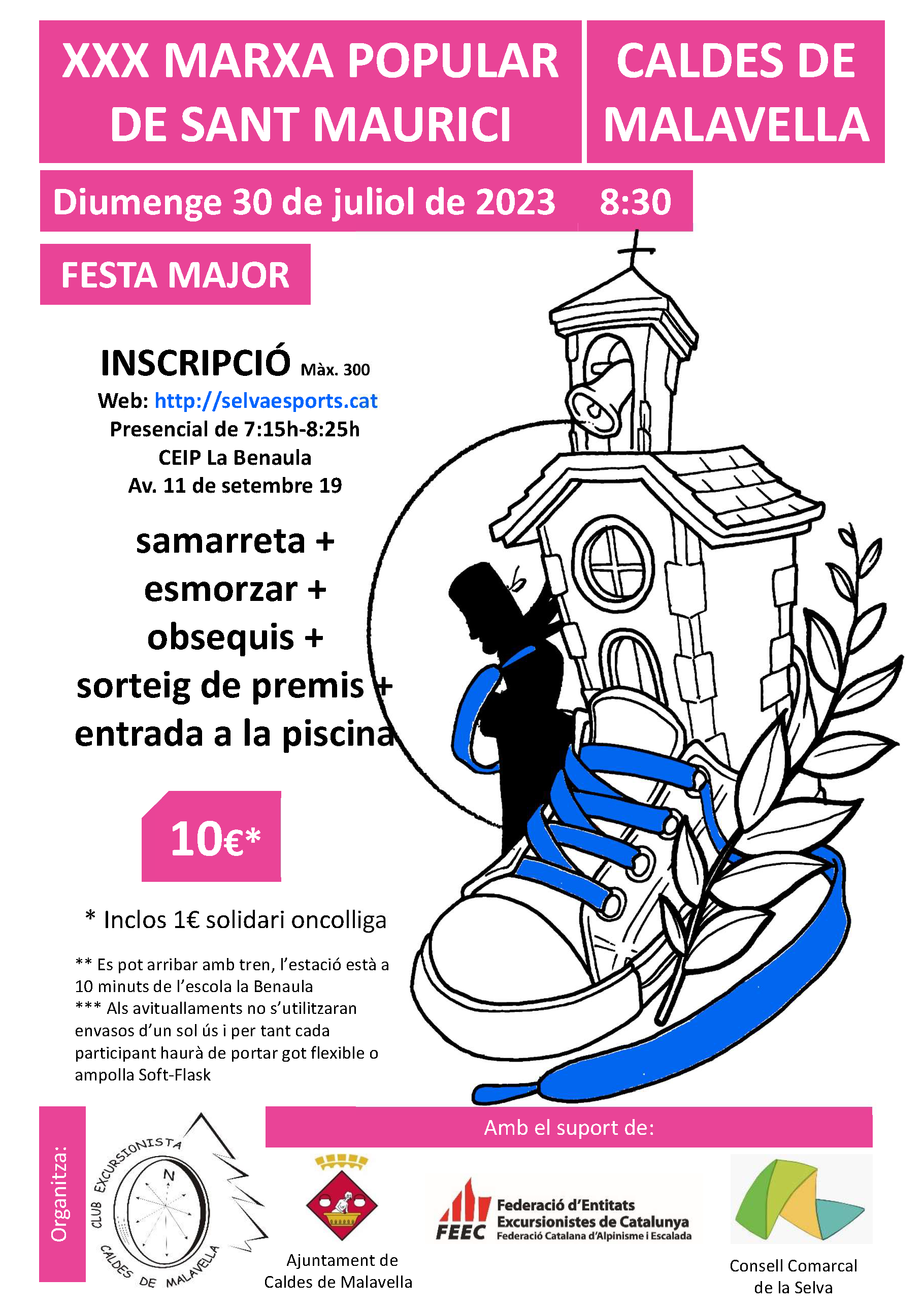 El Club Excursionista de Caldes de Malavella organitza, amb motiu de la Festa Major, la XXX Marxa Popular de Sant Maurici. Serà el 30 de juliol i constarà d’un recorregut d’uns 10 km. El punt de sortida, com és habitual, serà a la cruïlla entre l’avinguda dels Països Catalans i l’avinguda 11 de setembre.
