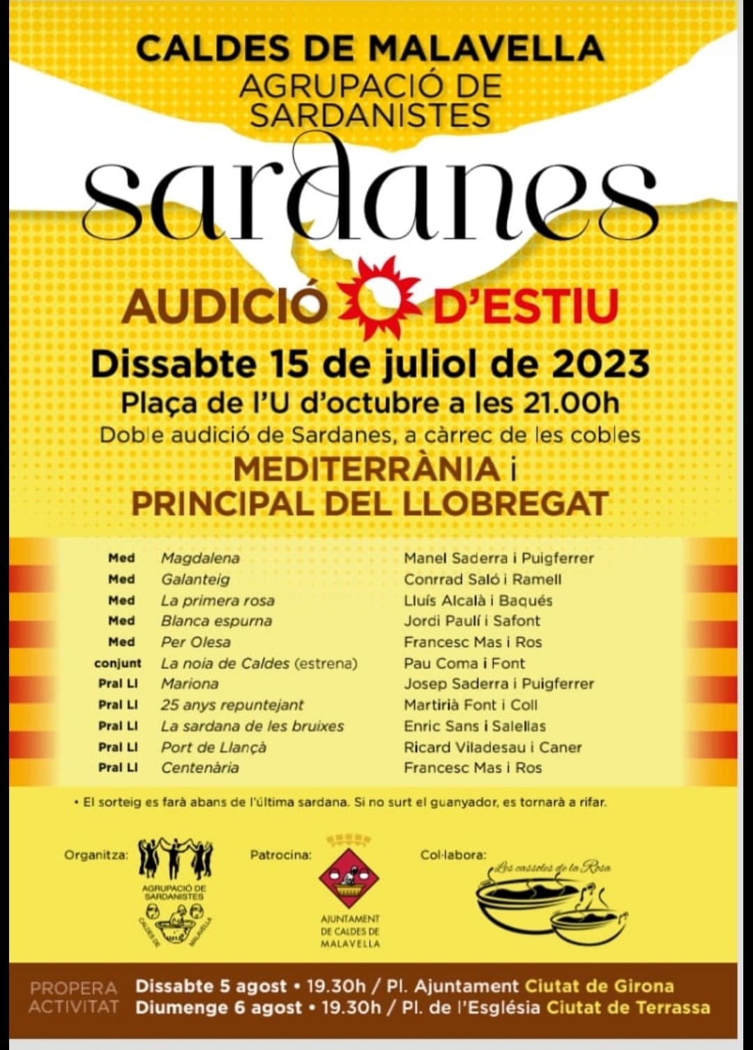 L’Agrupació de Sardanistes de Caldes de Malavella organitza una audició d’estiu. El 15 de juliol, a les 21 h, hi haurà una doble actuació a càrrec de les cobles Mediterrània i Principal del Llobregat. El concert es farà a la plaça de l’U d’Octubre i comptarà amb l’estrena de la sardana “La noia de Caldes”, de Pau Coma, que es tocarà de forma conjunta entre les dues agrupacions.