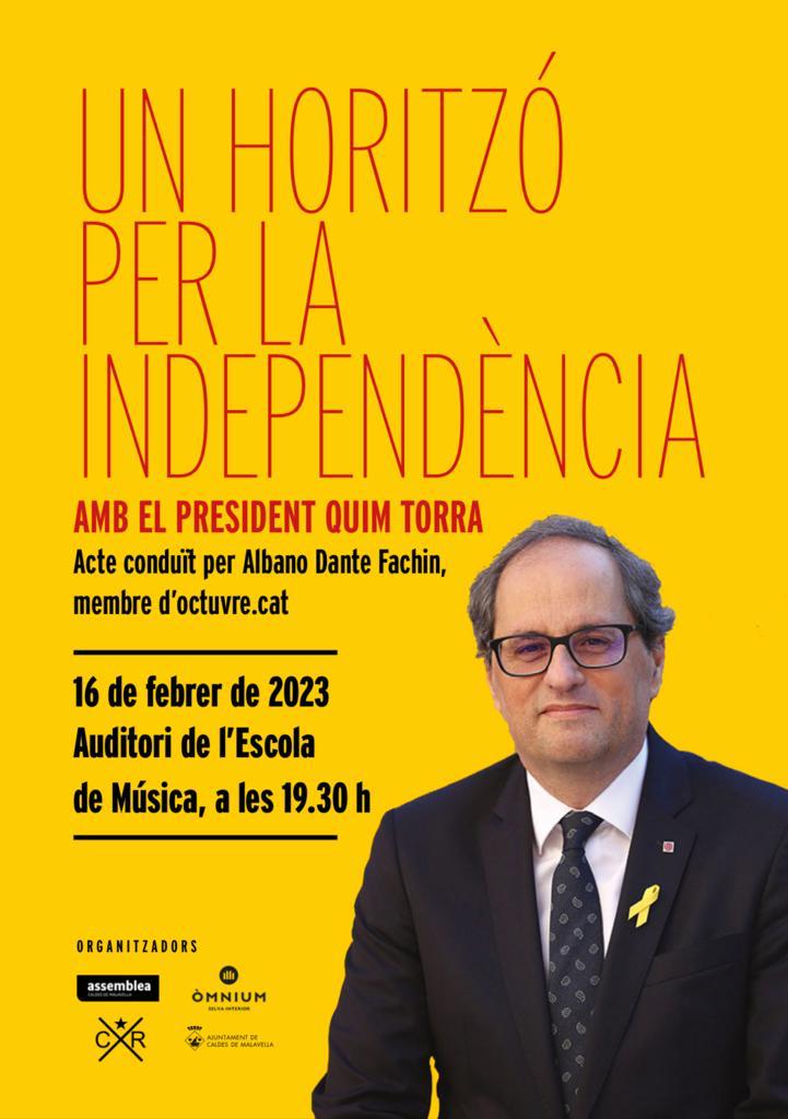 El dijous 16 de febrer, a l’Auditori de l’Escola de Música, hi ha programada una xerrada titulada: “Un horitzó per la indpendència” amb el President Quim Torra.