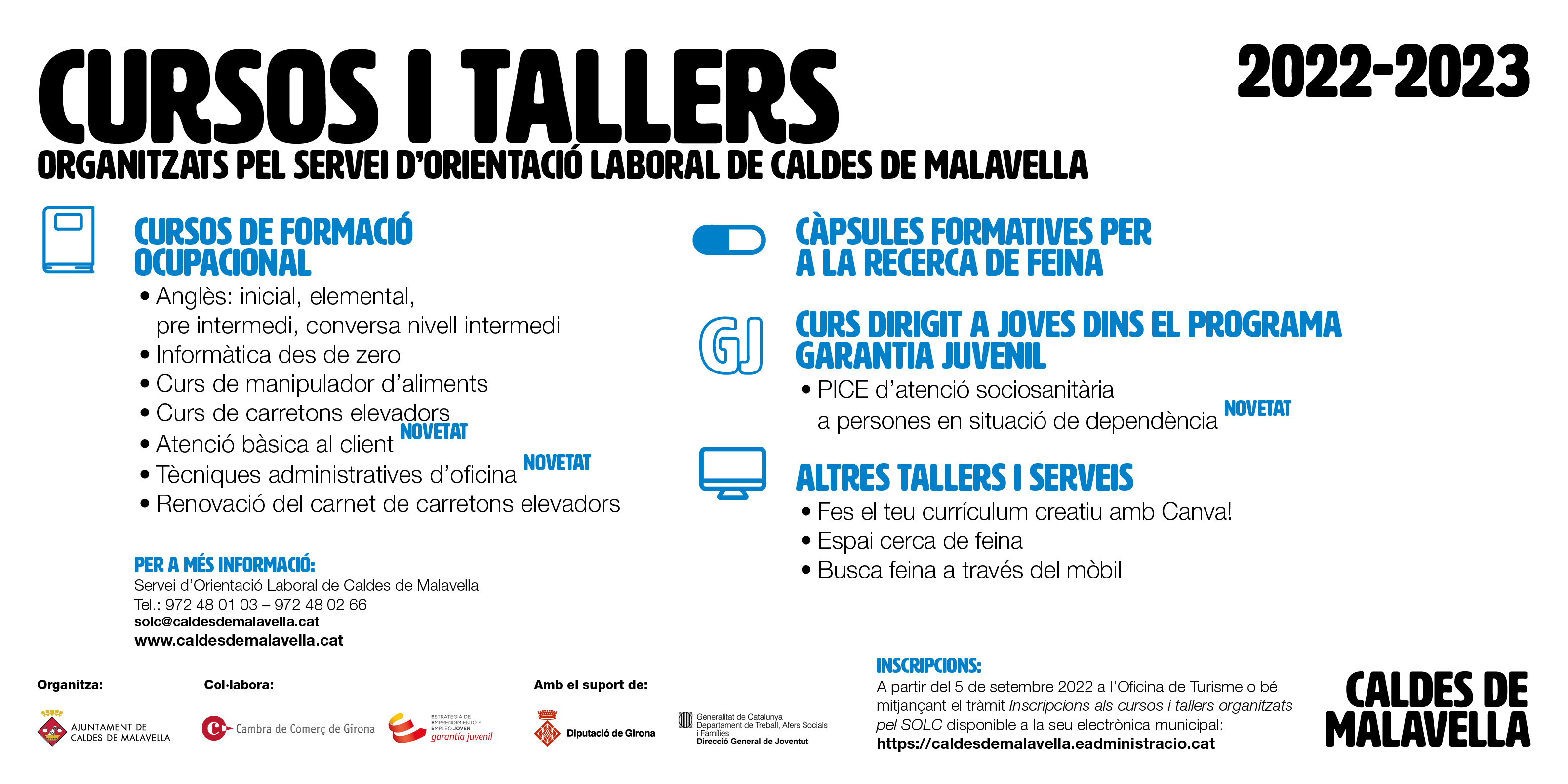 Les inscripcions tindran lloc a l'Oficina de Turisme o bé mitjançant el tràmit Inscripció als cursos i tallers organitzats pel SOLC disponible a la seu electrònica municipal https://caldesdemalavella.eadministracio.cat.