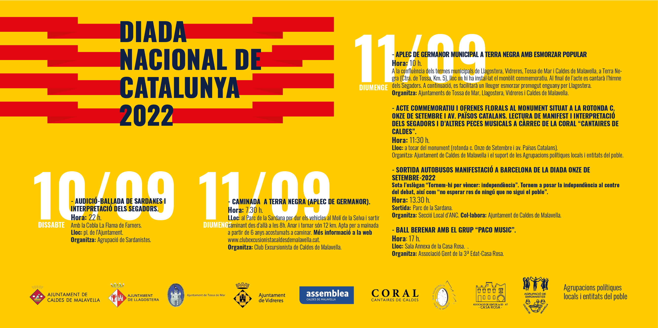 11.30 h · Acte commemoratiu i ofrenes florals al monument situat a la rotonda C. onze de setembre i Av. països catalans. Lectura de manifest i interpretació dels segadors i d'altres peces musicals a càrrec de la coral "Cantaires de Caldes". Organitzat per l'Ajuntament de Caldes de Malavella i el suport de les Agrupacions polítiques locals i entitats del poble.