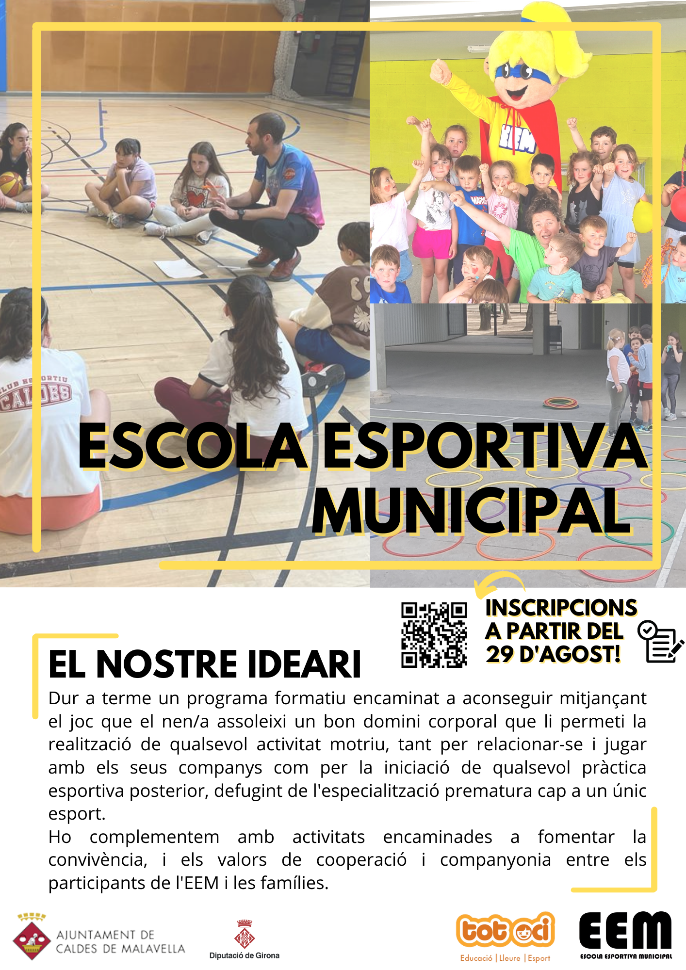L'Escola Esportiva Municipal iniciarà el mes vinent el seu 28è curs lectiu i continua promovent un programa formatiu encaminat a aconseguir mitjançant el joc que el nen/a assoleixi un bon domini corporal que li permeti la realització de qualsevol activitat motriu, tant per relacionar-se i jugar amb els seus companys com per la iniciació de qualsevol pràctica esportiva posterior, defugint de l'especialització prematura cap a un únic esport. A partir dels 8 anys compta amb 3 itineraris esportius: Atletisme, bàsquet i voleibol.
