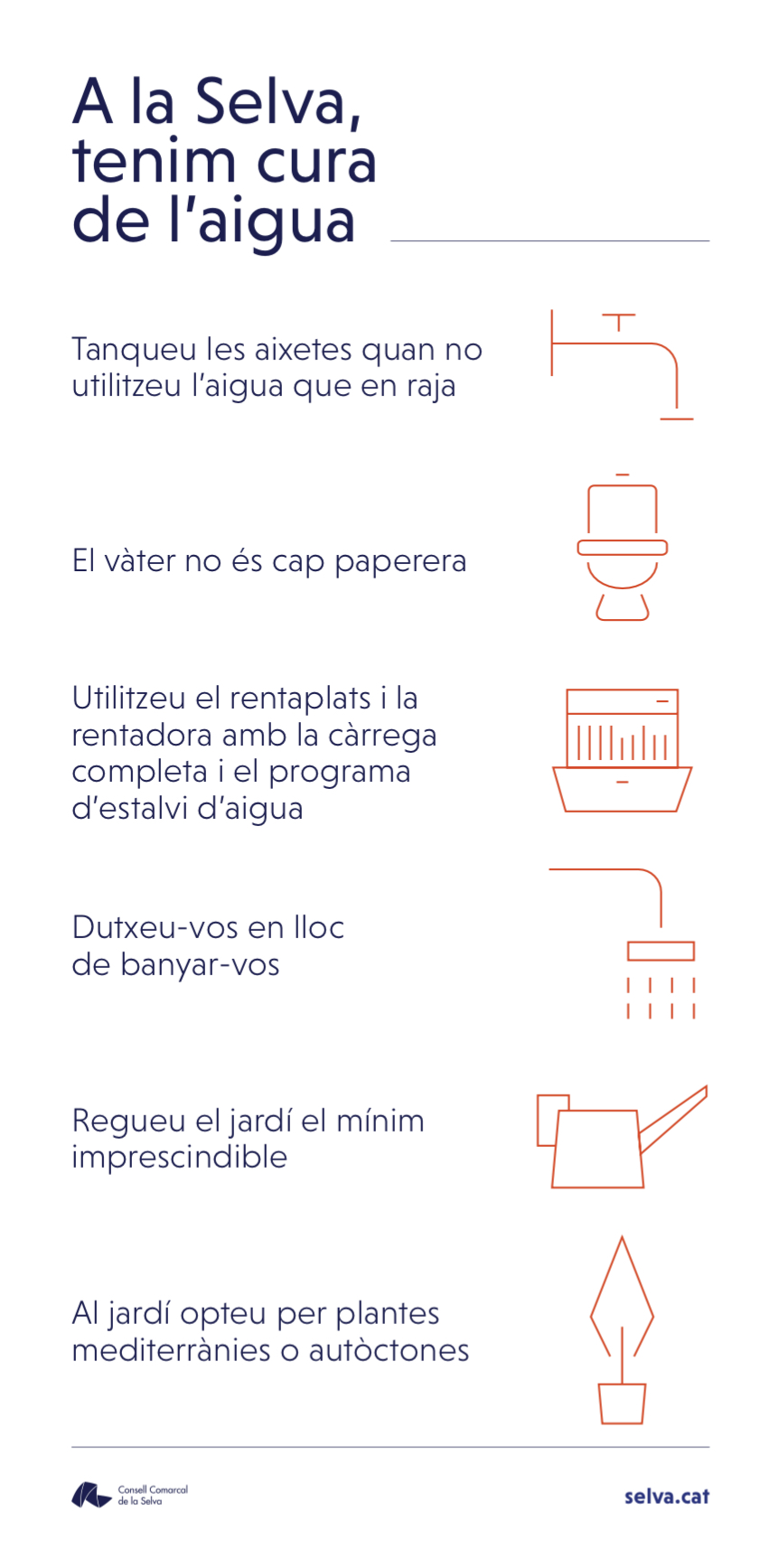 Es recomana fer un bon ús de l'aigua domèstica i no malgastar-la. És tan important hidratar-se i seguir els consells de salut per combatre l'onada de calor d'aquests dies com fer un ús responsable de l'aigua. Per això, recorda: