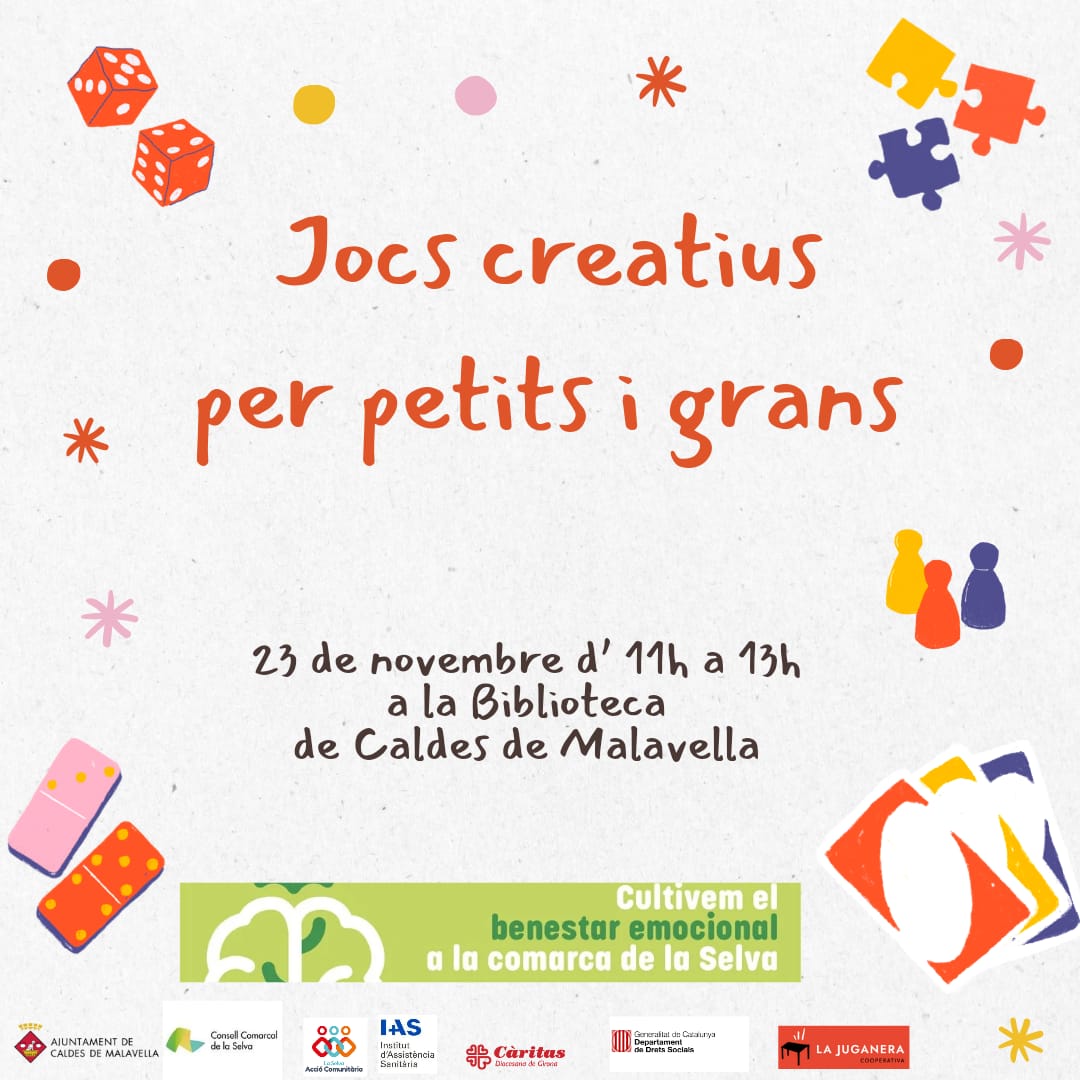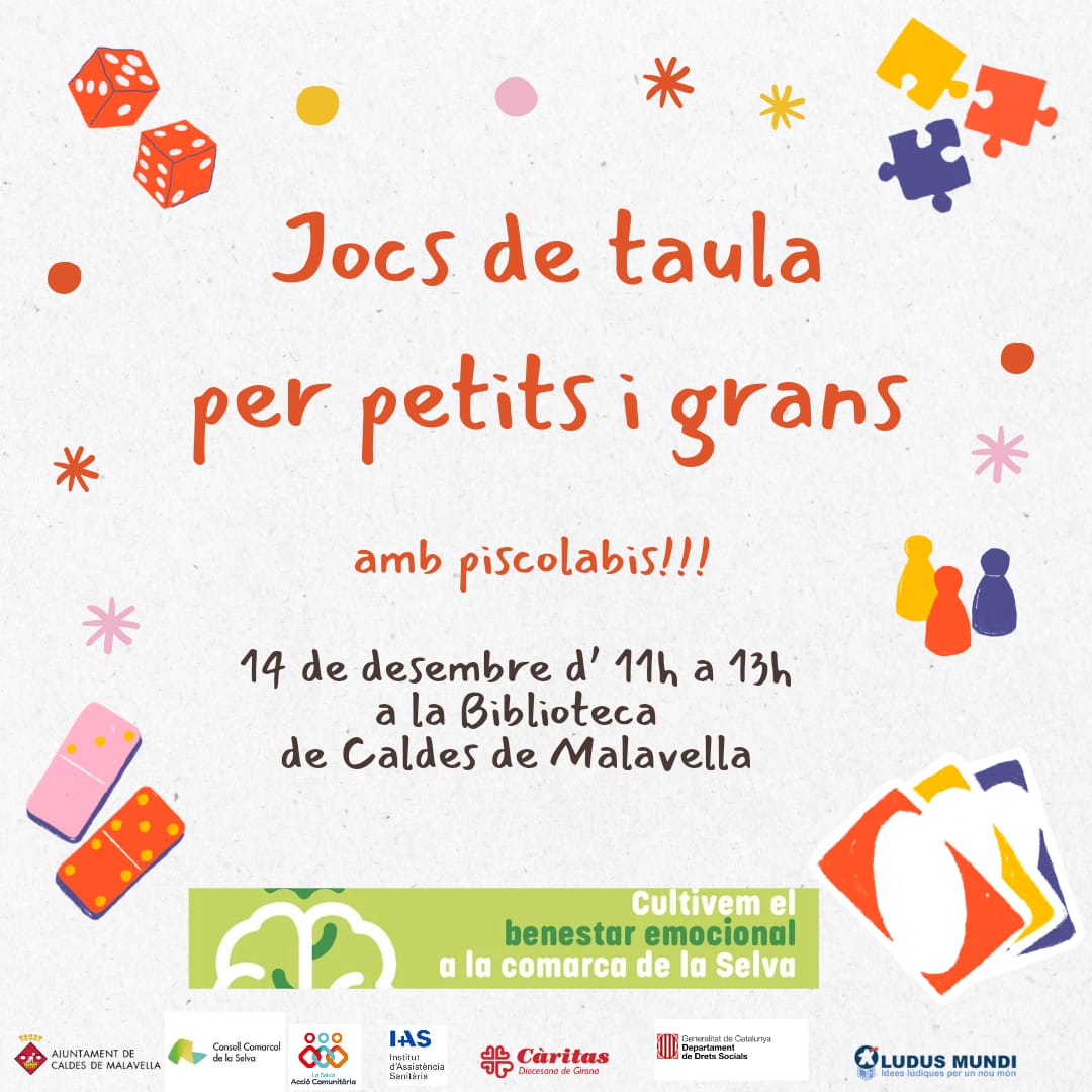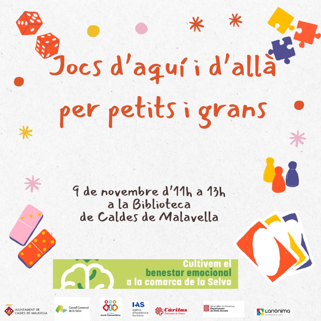 L’Ajuntament de Caldes de Malavella conjuntament amb el Consell Comarcal de la Selva organitza una Jornada de Jocs en Família el pròxim 26 d'octubre d’11 a 13 hores a la Biblioteca Municipal, Jocs moderns per a petits i grans. Aquesta activitat, que comptarà amb la dinamització de dos professionals, s'emmarca dins del Pla Local d'Acció Comunitària Inclusiva (PLACI) i té com a objectiu promoure el benestar emocional a través del joc en família.