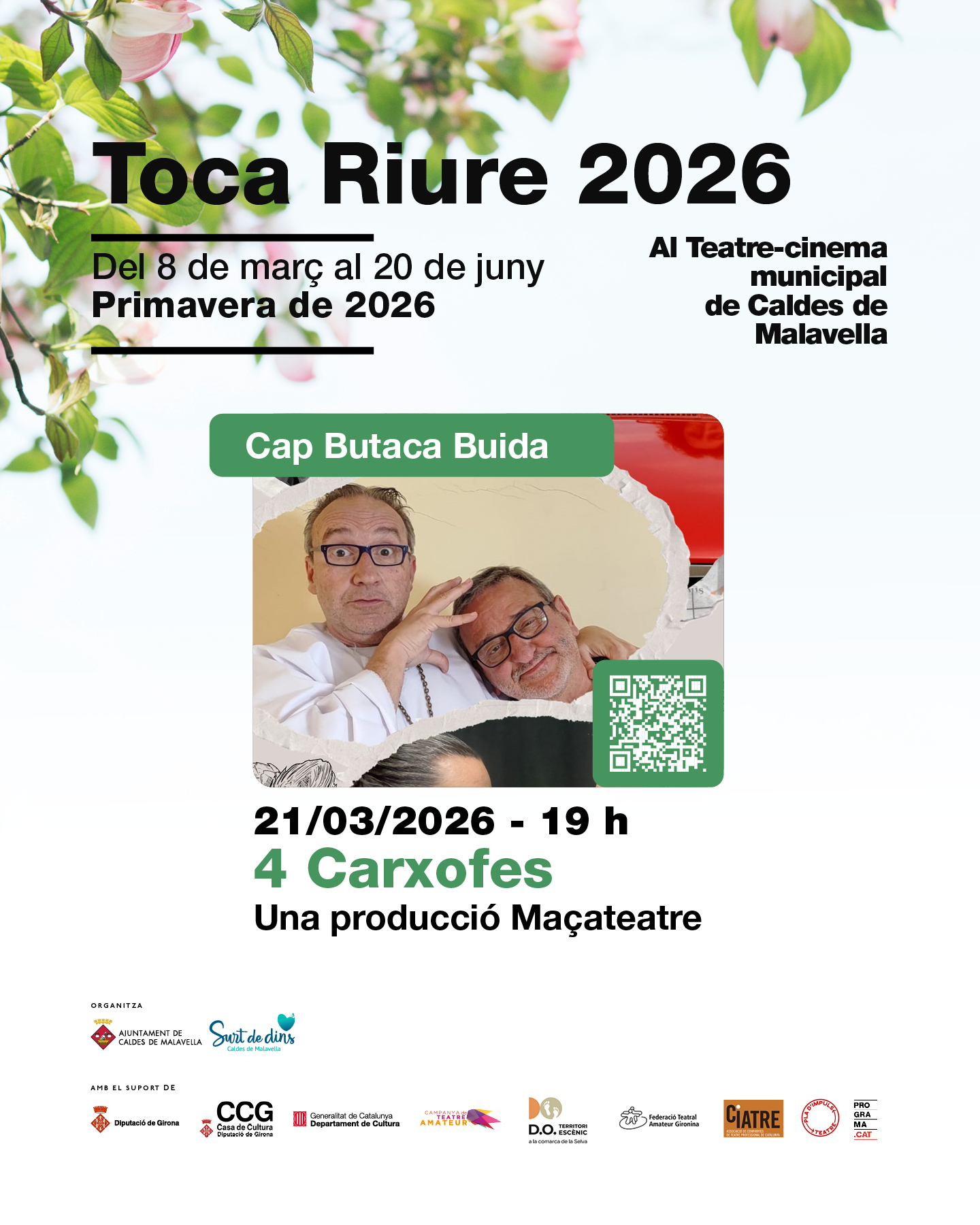 Caldes de Malavella d’adhereix a la campanya Cap Butaca Buida del Departament de Cultura de la Generalitat de Catalunya, pensada per omplir els teatres de tot Catalunya. Ho farà amb la proposta 4 carxofes, una comèdia de Maçateatre que es podrà veure el 21 de març, al Teatre Municipal, a les set de la tarda.