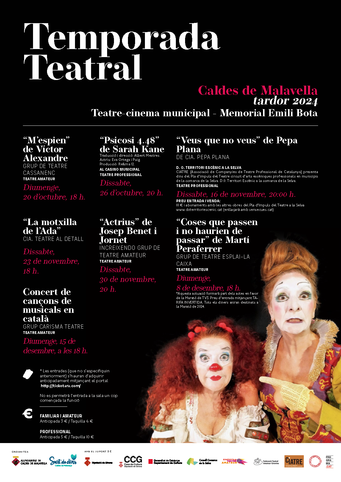 Al novembre hi haurà dues obres més. D’una banda, “La motxilla de l’Ada”, de la companyia Teatre al Detall, es podrà veure el dia 23, a les 18 h. Es tracta d’un espectacle que parla de la identitat de gènere a través de l’experiència de la seva protagonista. I, d’altra banda, Increixendo Grup de Teatre Amateur es capbussarà en el clàssic “Actrius”, de Josep Benet i Jornet, una proposta que debat sobre el teatre i el món de l’espectacle a través de la veu de quatre dones. Serà el 30 de novembre, a les 20 h.