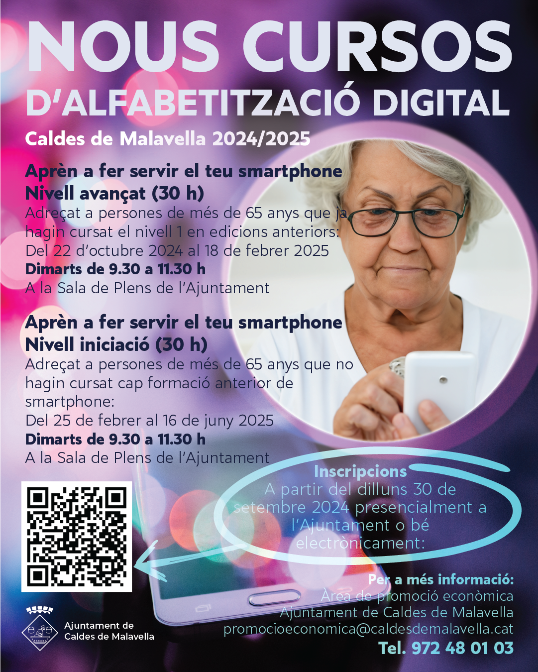 L'àrea de Promoció Econòmica de Caldes de Malavella organitza dos cursos d’alfabetització digital adreçats a persones majors de 65 anys. Ambdós estan pensats per aprendre a fer servir l’smartphone, el telèfon intel·ligent, però un és d’iniciació i l’altre de nivell avançat. Les inscripcions es podran fer a partir del 30 de setembre a l’Ajuntament o electrònicament a través d’aquest enllaç.