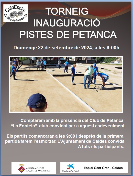 El pròxim diumenge 22 de setembre tindrà lloc la inauguració oficial de les noves pistes de petanca a Caldes, amb un torneig que començarà a les 9 h del matí que organitza L'Esplai Gent Gran de Caldes. L'esdeveniment comptarà amb la participació del Club de Petanca "La Fonteta", que ha estat convidat com a club especial per a aquesta jornada.