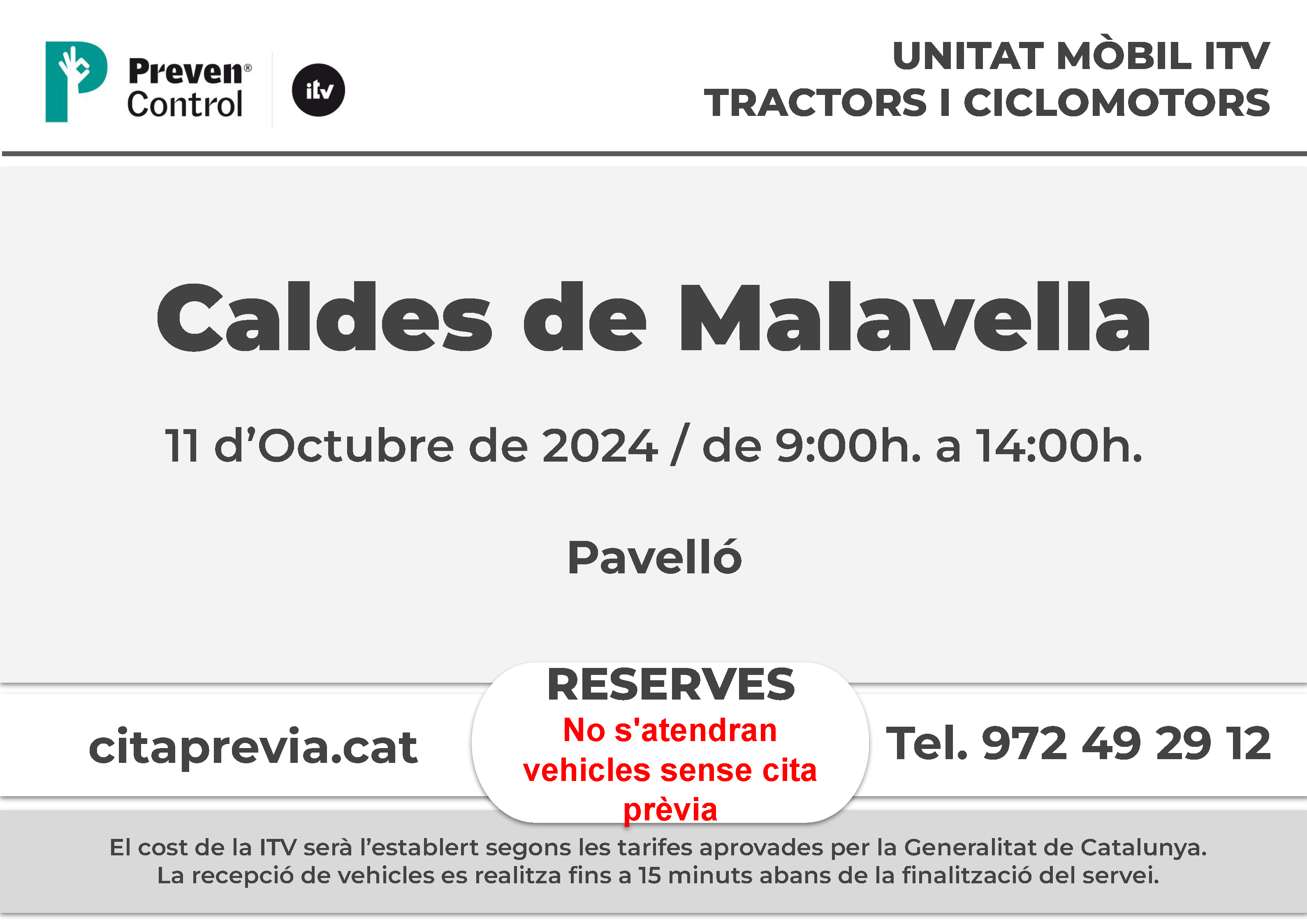Una Unitat Mòbil de la ITV (Inspecció Tècnica de Vehicles) es desplaçarà a Caldes el proper divendres 11 d'octubre, per a fer inspeccions a vehicles agrícoles (tractors i remolcs) i ciclomotors de 49 cm3.