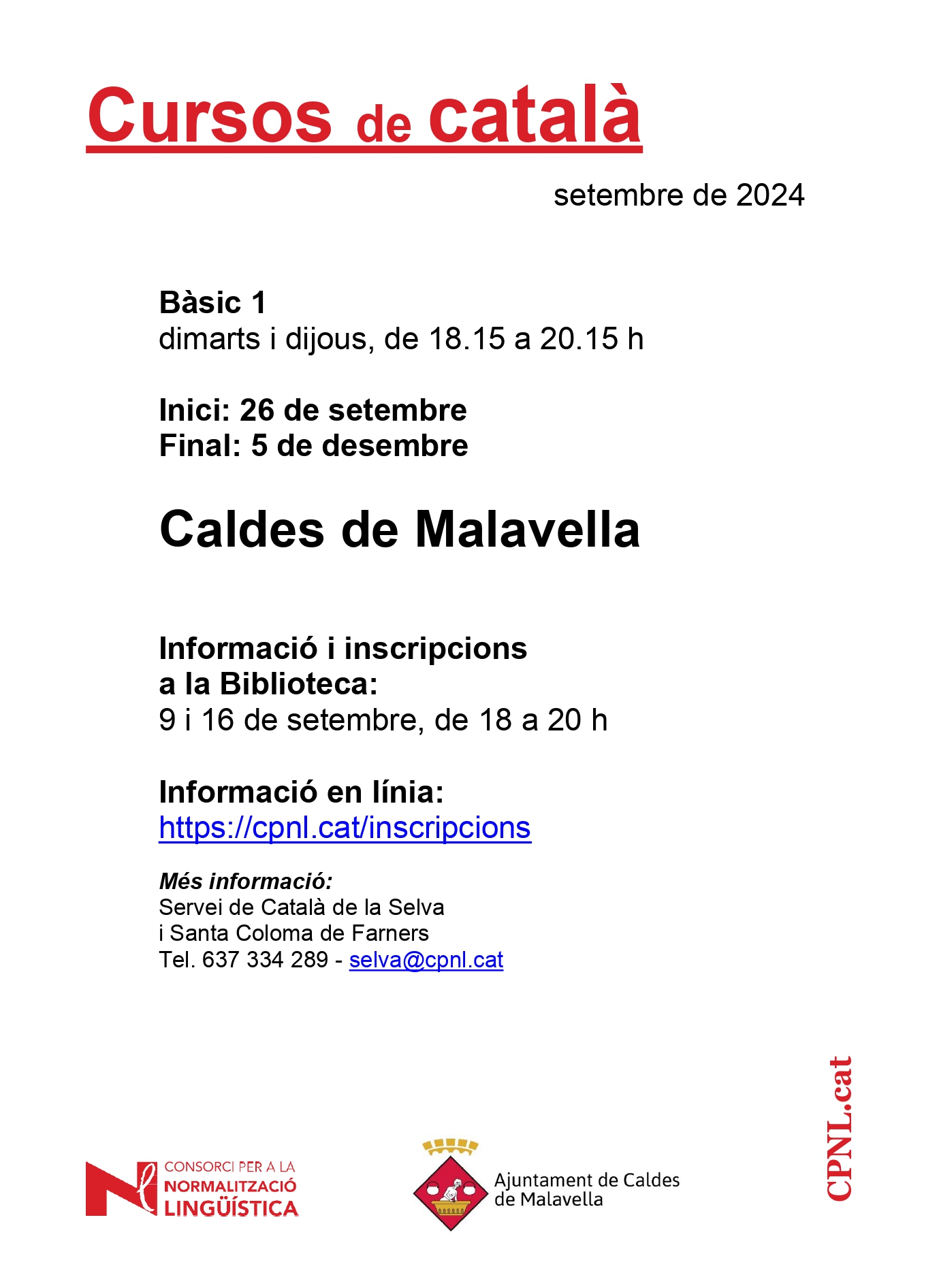 El Consorci per a la Normalització Lingüística engega a Caldes de Malavella un Curs de Català de nivell bàsic. Les classes començaran el 26 de setembre i s’allargaran fins al 5 de desembre. Seran els dimarts i dijous, de 18.15 a 20 hores. És gratuït, però cal inscriure-s'hi abans del 6 de setembre i acreditar un certificat de nivell de català. En cas de no disposar-ne, s’ha de sol·licitar una prova de nivell.