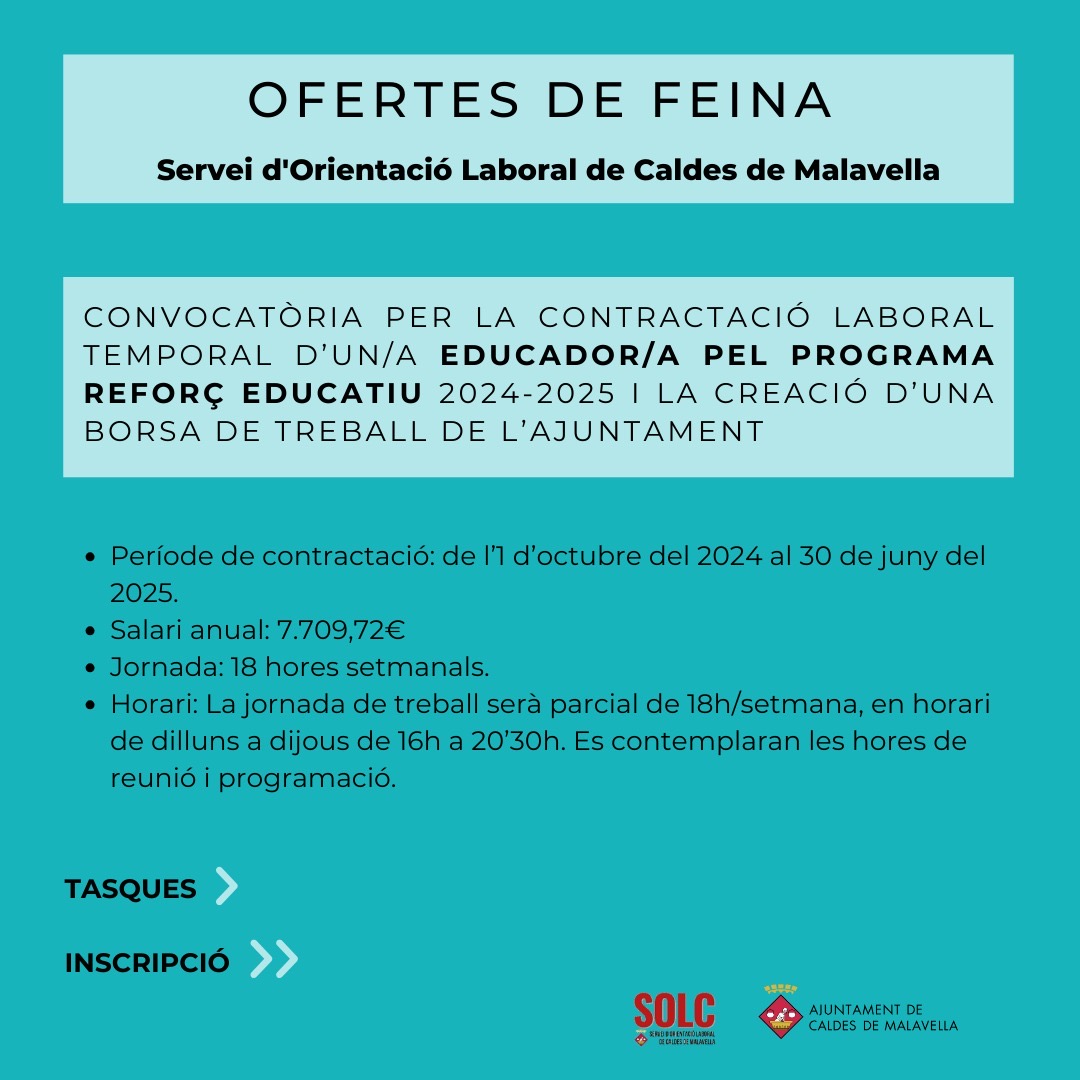 CONVOCATÒRIA PER LA CONTRACTACIÓ LABORAL TEMPORAL D'UN/A EDUCADOR/A PEL PROGRAMA REFORÇ EDUCATIU 2024-2025 I LA CREACIÓ D'UNA BORSA DE TREBALL DE L'AJUNTAMENT• Període de contractació: de l'1 d'octubre del 2024 al 30 de juny del 2025.