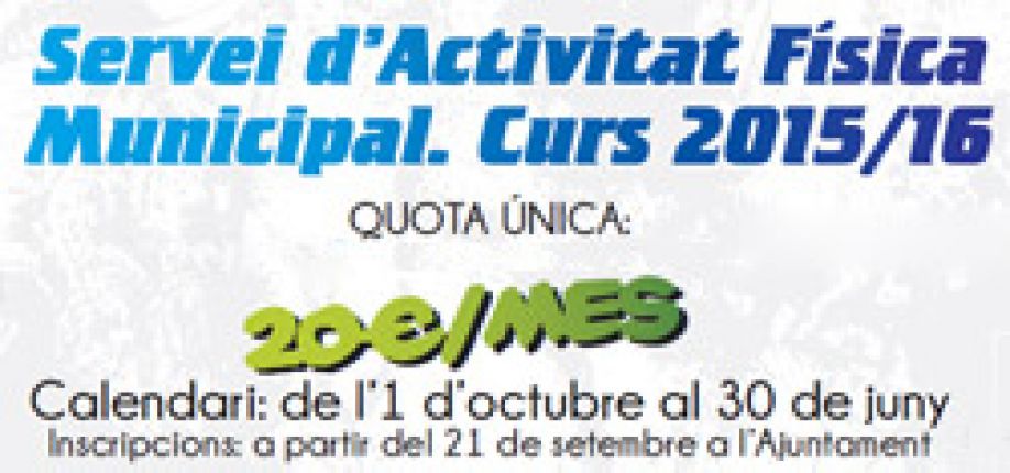 Comença una nova temporada del Servei d'Activitat Física Municipal. Clicant la imatge podeu descarregar-vos-en el document en PDF amb tota la informació. Les inscripcions s'obren el 21 de setembre!