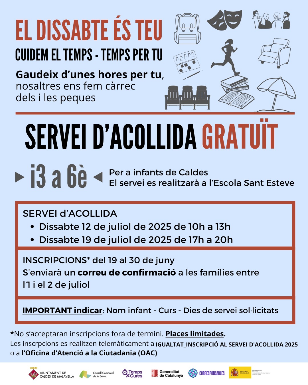 - Esplai la Caixa: Juliol, de 10 a 13 i de 16 a 20 h; i aogst de 16 a 20 hores.